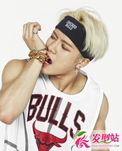 男生短发染发发型,白金色的染发是现在韩国比较流行的发色,戴上运动发带特别青春。