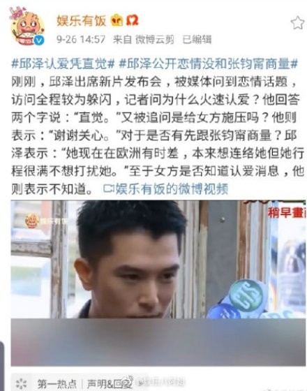 9月26日,邱泽方回应与张钧甯恋情后,首次公开现身,出席新片发布会。此前,邱泽传出与张钧甯恋情后,其经纪人表示“努力追求中,请大家祝福。”