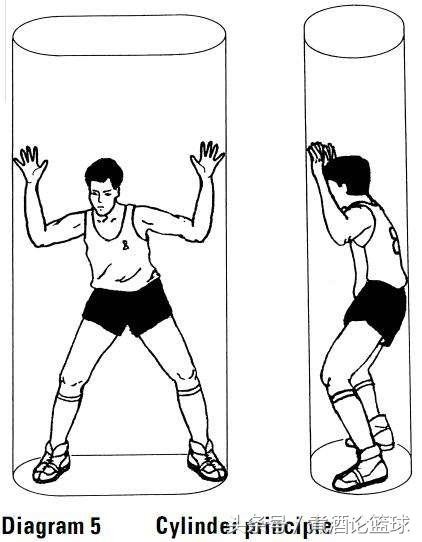 防守球员可以将双臂和双手举过头顶,也可以垂直起跳,但必须保持身体在此圆柱体内垂直的空间上,这样就不算犯规;所以制造进攻犯规的时候不但要求站定,而且不能是侧对进攻球员。