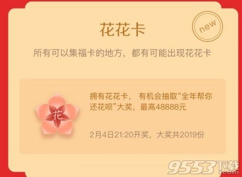 其实花花卡在所有可以集福卡的地方,都是有可能出现花花卡的,拥有花花卡,还有机会抽取“全年帮你还花呗”大奖,最高48888元,2月4日21:20开奖,大奖共2019份。也就是说AR扫福,福气林、蚂蚁庄园、答答星球都是可以有机会获得花花卡的。