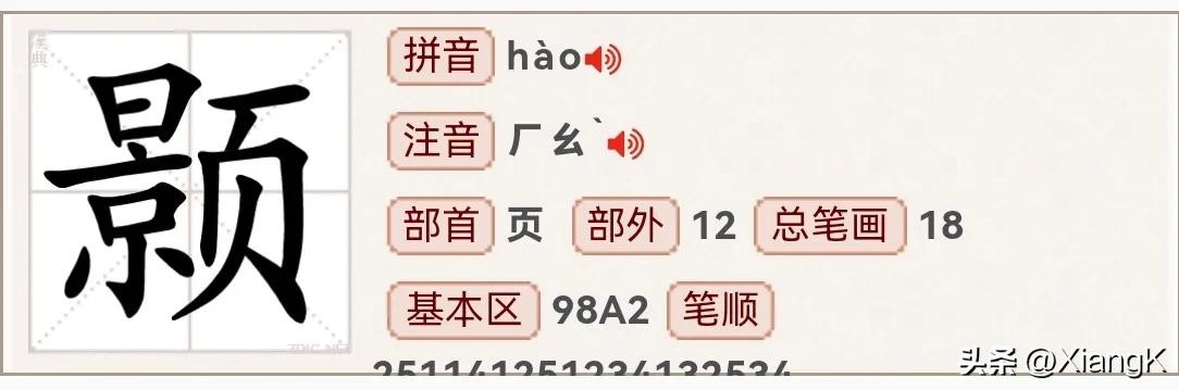 读音为“hào”,同音字“皓”,部首为“页”,总笔画18,左右结构。