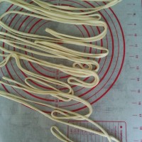 8.手持粗面条的两端,上下轻轻抻打,和做拉面的动作差不多,面条慢慢就被拉细拉长。