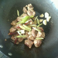 19.炒到鸡肉变色,加干辣椒姜葱蒜八角炒香。