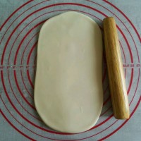 5.饧好的面团擀成半厘米厚的面皮。