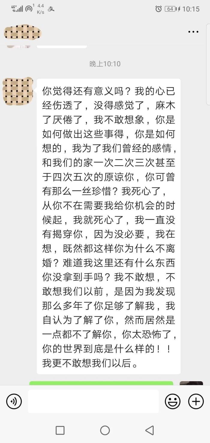 没过多久他也出轨了,现在要跟我提离婚,而且态度很坚决,他说他很恨我,不想再跟我继续生活了。