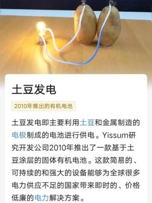 他们图发现了一种能让土豆发电的简单却又十分聪明100字的方法,土豆发电原理动画,土豆可以发电的原理图。来自耶路撒冷希伯来大学的拉宾诺维茨表示,一颗土豆就足够为一个房间的LED灯泡提供40天的电能。