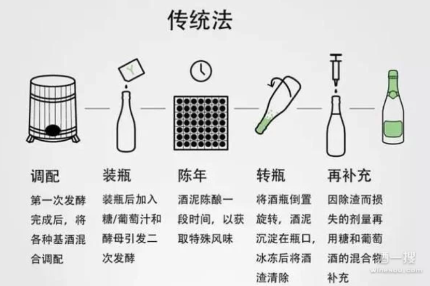 香槟产区也有自己独特的酿造方法,称作“香槟法”,也被叫做“二次瓶中发酵法”。