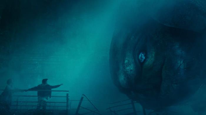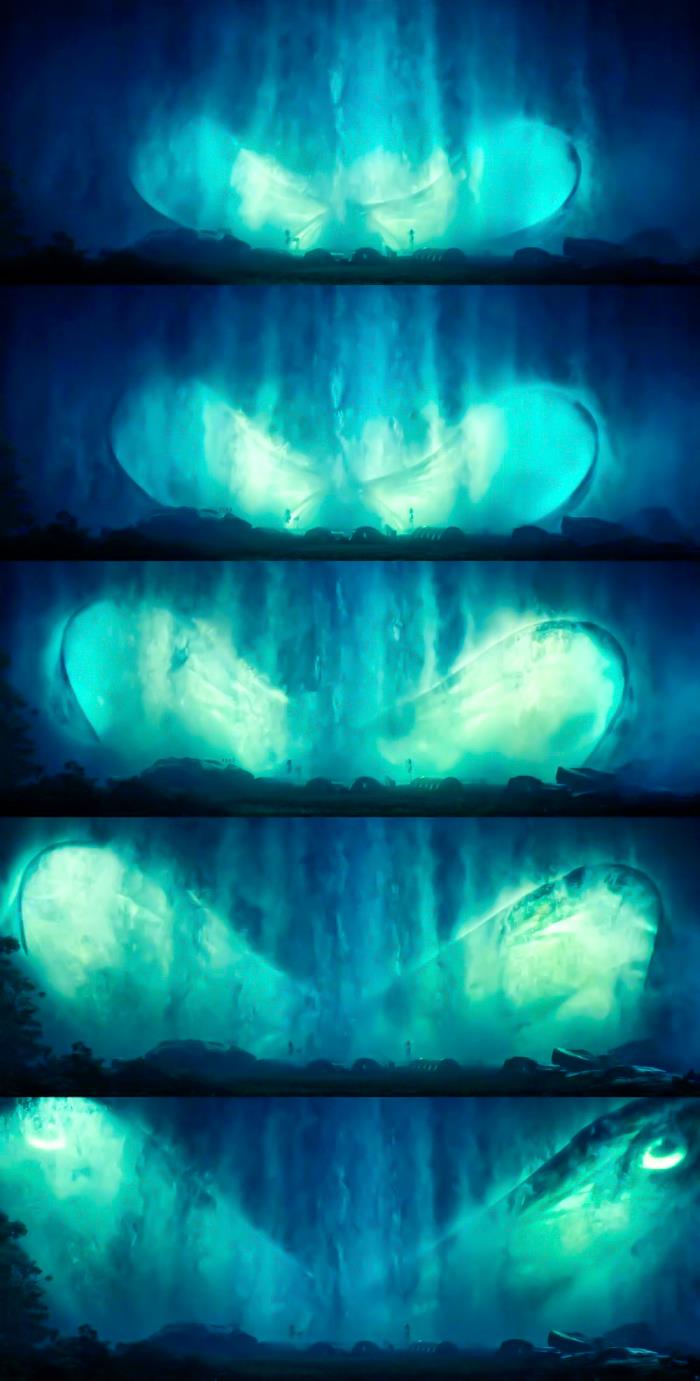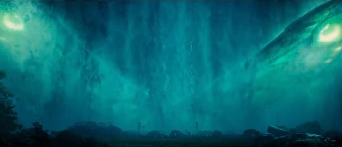 后来,魔斯拉躲到了瀑布下面,那时候它已经变成了蛹的形态。镜头切到魔斯拉那边的时候,它正要开始孵化。只见它在瀑布下面散发着蓝色的光芒,然后慢慢地展开翅膀,画面极其惊艳,连章子怡饰演的陈艾琳博士都看呆了。