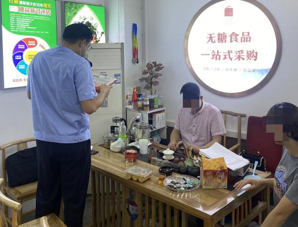 6月20日,集美区杏林市场监管所执法人员对一家宣称“无糖食品”的专卖店开展突击检查,发现该专卖店门店招牌印有“某某无糖食品”“中老年人/瘦身/孩子”等文字,门店内悬挂的广告牌印有“0糖/0脂/低升糖/高品质”“不吃药不打针健康长寿享终生”等宣传语。