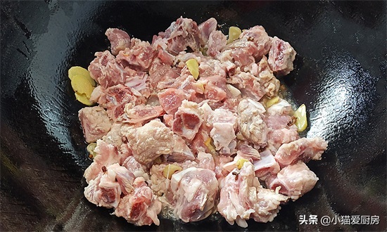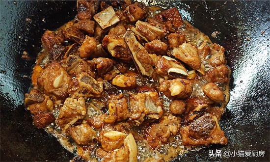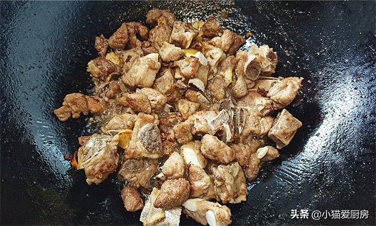 排骨下锅要先用大火炒干水汽,然后用中小火慢慢炒,把排骨炒熟、炒透、炒出油脂,直到微黄为止。