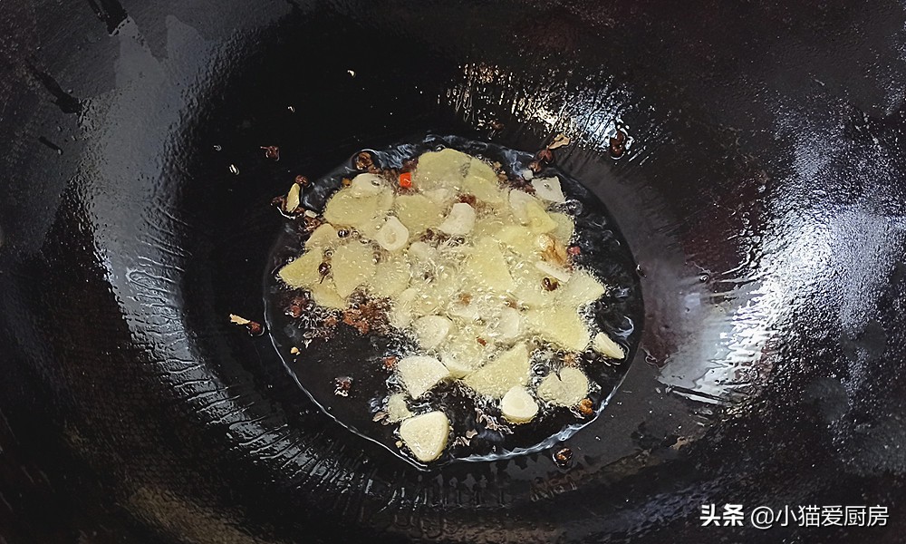 【步骤四】:炒锅中放一勺油,放入姜蒜、花椒粒,小火炒出香味。