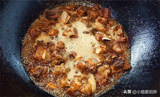 【步骤九】:排骨焖煮10分钟后,开大火把剩余的汤汁收浓。