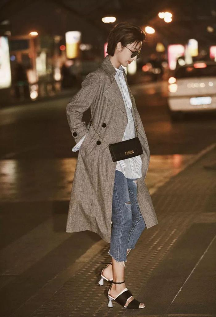 小个子女生与其穿厚底鞋来“增高”,不如试试款式更为轻巧的猫跟鞋,其鞋跟的高度一般处于3.5cm~4.5cm之间,比常规的高跟鞋要好驾驭许多,上脚后没有什么行走负担,但又能有效地绷直小腿部位,显腿细腿长,即便是高跟鞋新手也能轻松hold住。像张俪这身造型所穿的鞋子,便属于猫跟鞋,黑白拼色的款式既简约又高级,搭配牛仔九分裤,又能为整身LOOK增添一份随性感。