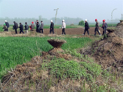 午时,开始出殡了,一群长长的送殡队伍向村西边的麦田缓缓行进。麦田深处,赫然现出一个新挖的长方形墓坑,墓坑略呈西北东南向,挖出的黄土堆在墓坑四周的麦田上。一辆四轮拖拉机拉着一口厚厚的桑木棺材,前边是男孝子引领,后边簇拥着孝女和客人。在墓地,打墓人员缓缓地抬起棺材,使之按照方位落入墓坑。司仪左手向天扬起,右手拿着一本书诵读着。一声令下,下葬开始了。铁锹挥动着,一锹锹土落在了棺材上。孝子男女哭声阵阵,伴着乐声、掘土声、司仪的号令声,闹闹嚷嚷。
