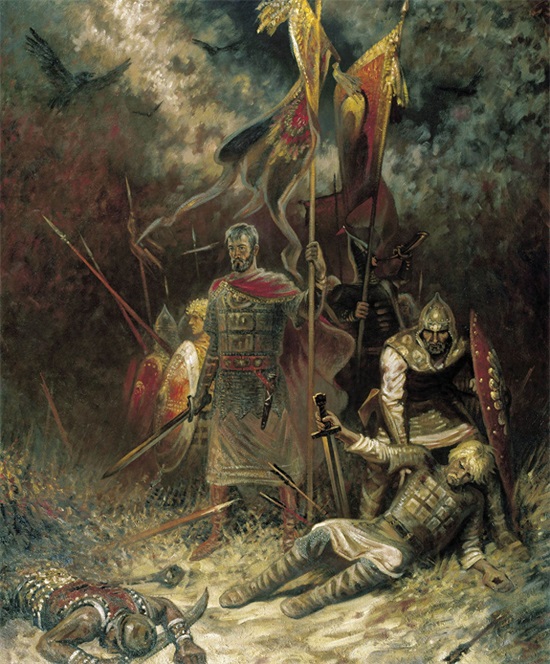 伊戈尔死后,其子“勇敢的”斯维亚托斯拉夫一世(Sviatoslav I of Kiev ‘the brave’)在945年即位基辅大公。这位君主十年的统治生涯都是在马背上度过的,他能征善战,先后击败了可萨汗国、阿兰人和保加利亚第一帝国,又吞并了许多东斯拉夫民族的零散部落。在他统治期间,基辅罗斯版图扩张一倍有余。