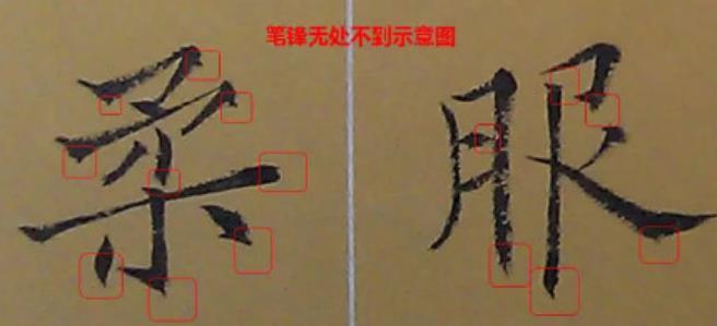 释读:“末”,“端”也,锋谓末,指任何点画都要用笔锋写出,须处处将笔锋送到,使笔力充分作用于纸面,收坚实凝重之效。清人蒋和说:“(用笔)如善舞竿者,神泛竿头,善用枪者,力在枪尖。”点画要意完神足,须笔锋无处不到。即使末笔蛮要出锋劲键,才能不犯拖沓之病。如“也”字楷书末笔要缓起轻收,形成的钝势小勾就像刚刚把弓拉满,箭头被一点点的缩到了弓背的挽手处;在书写过程中要注意笔锋的调整,切不可因为是末笔就草率为之,造成笔锋的“散包”和线条的“泄气”。刘熙载《书概》说:“张文史(张旭)书,微有点画处,意态自足,当知微有点画处,皆是笔锋实实到了。不然虽大有点画,笔心反而不到,何足之可云!“