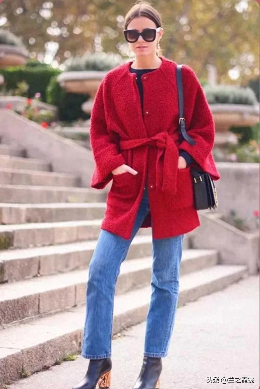 除了上面的颜色搭配,我们也可以尝试牛仔裤的搭配。牛仔裤与红色外套的搭配,能够给人一种温暖、减龄的感觉,很适合冬季的穿搭。如果你想要打造一个热情、减龄的形象,可以尝试这种裤子来搭配红色外套。