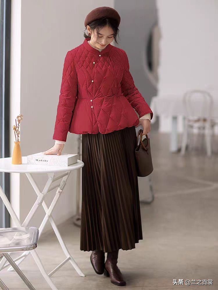 深咖色与红色搭配,这两种颜色也是经典的组合,深咖色百褶半身裙与红色外套搭配,可以衬托出红色,使其看起来更加高贵、典雅,而这种整体穿搭,会让你更加显得沉稳、雅致。