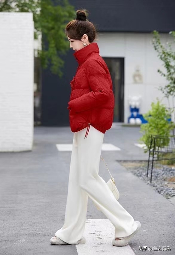 除了黑色,白色也是与红色搭配的经典选择。白色与红色的组合会给人一种清新、明快的感觉,是非常减龄的穿搭。白色阔腿裤可以让红色外套更加亮丽,让整体造型更加抢眼。如果你想要展现出一种阳光、活力的形象,可以选择白色下装来搭配红色上衣。