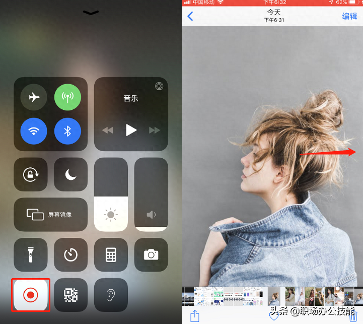 我们现在的手机中,很多都有录制屏幕的功能,直接把要做成视频的照片素材按顺序排放在相册中。然后把画面定格在这里,点击图中的“红框”图标,开启录屏。