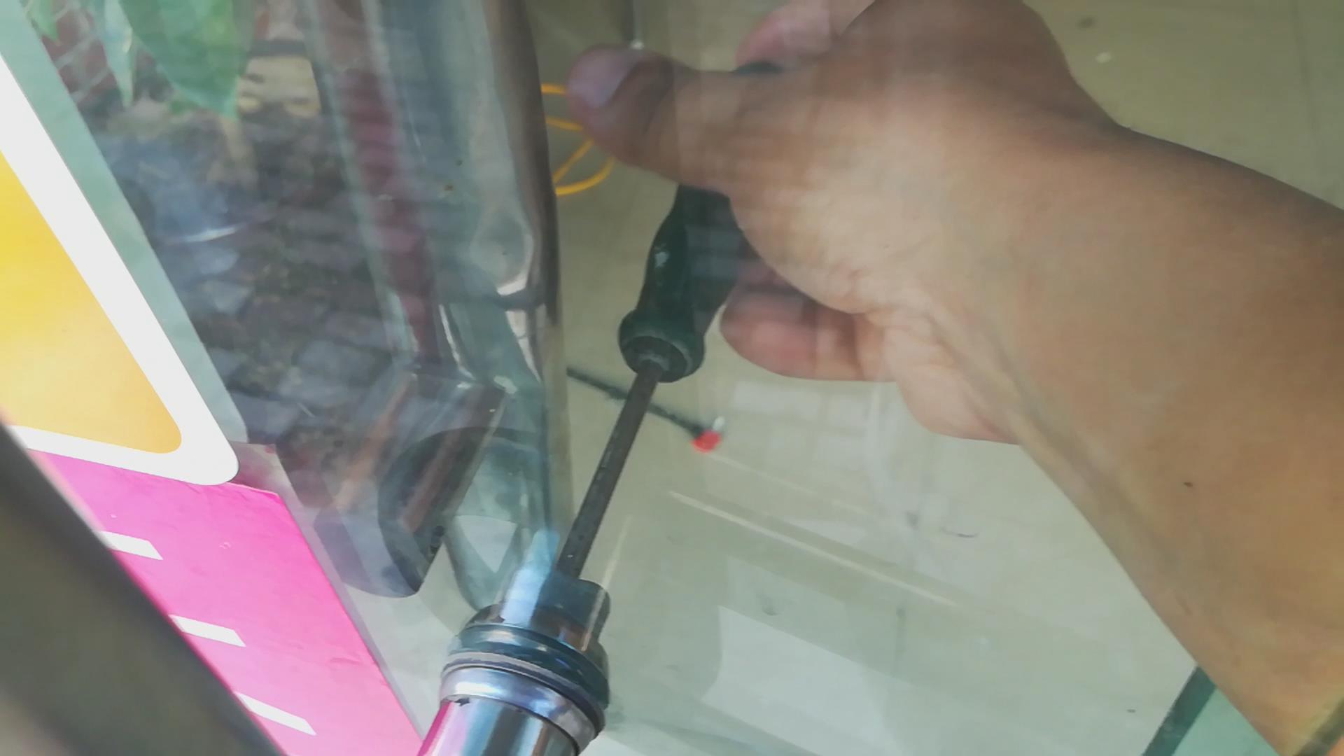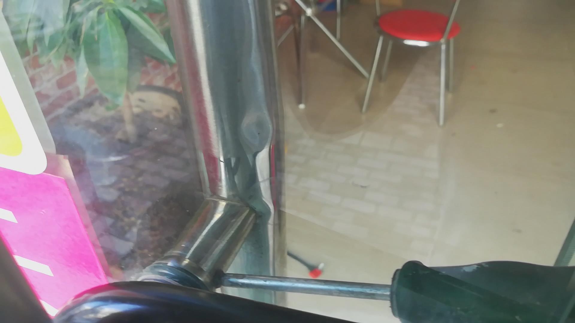 把门推开个缝,手伸进去卸螺丝。