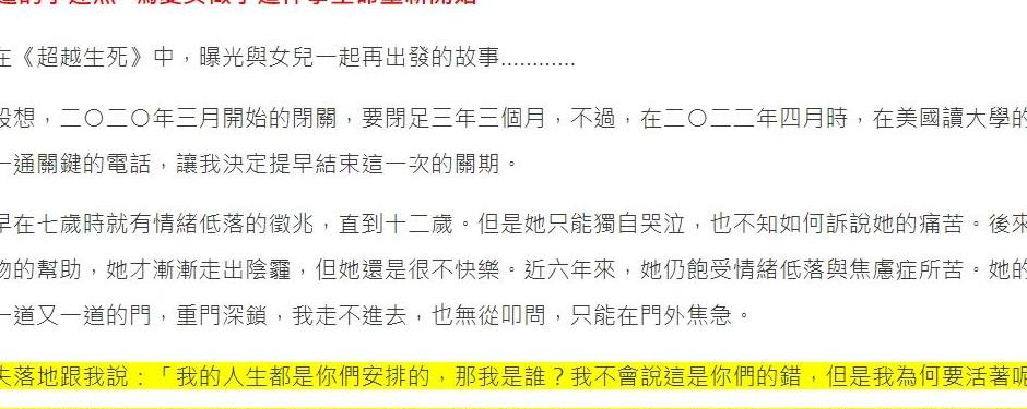 在新书中,李连杰提到女儿曾说:“我的人生都是你们安排的,那我是谁?我为何要活着呢?”这让他开始深刻地反省,自己与妻子是否在女儿的人生中过度介入。