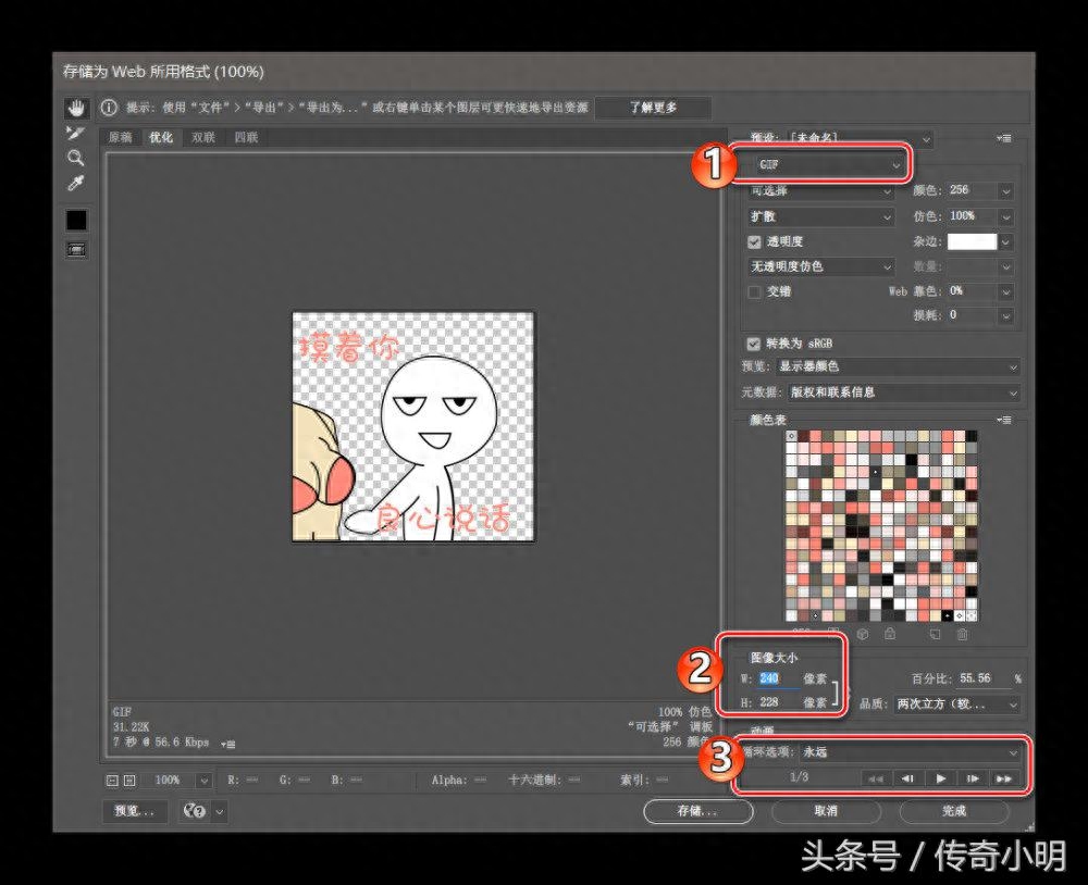 全部完成之后呢,就可以按快捷键Ctrl+Shift+Alt+S,调出“存储为web所用格式”,在圈1的位置将格式设定为gif,在圈2的位置设置图片的大小,圈3的位置可以再次设置循环选项以及可以预览,全部设置完成后点击“存储”,保存到本地文件夹即可。这就完成了gif表情的制作了。
