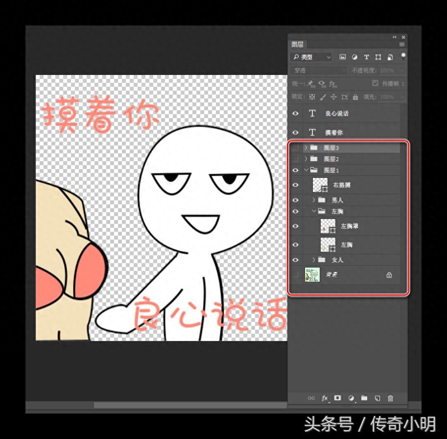 这里要建议一下,对于图层的命名大家一定要养成好习惯,这将极大地提高效率哦。这里呢,我在绘制完角色之后,分别编组了“男人”图层组、“女人”图层组,“左胸”图层组、“右胳膊”图层组,明确的图层命名,能够帮助我们快速找到需要做动作的元素。然后,在选中以上所有图层/图层组编组成“图层1”、并复制出“图层2”、“图层3”。