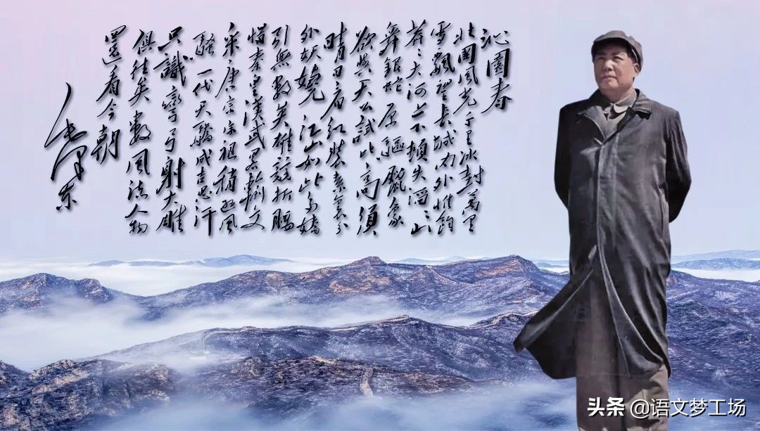 江山如此多娇,引无数英雄竞折腰。惜秦皇汉武,略输文采;唐宗宋祖,稍逊风骚。一代天骄,成吉思汗,只识弯弓射大雕。俱往矣,数风流人物,还看今朝。