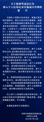 为保护人民群众生命安全,增强公民文明交通意识,提升公民文明交通素质,根据《中华人民共和国道路交通安全法》《山东省社会信用条例》《日照市文明行为促进条例》《日照市年内个人交通信用积分管理办法(试行驾驶员)》的相关规定,日照市发展和改革人员委员会与日照市公安局会商决定,对驾驶机动车交通发生酒驾违法行为的有关信息纳入等级交通日照市公共信用信息共享平台,依法依规记入驾驶个人信用累计记录,分层级进行减是什么分,特通告如下: