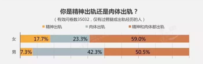 在有出轨经历的人中,显然男性大部分都有肉体出轨,这一项的比例远高于女性。