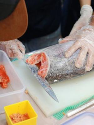 第一材料要新鲜,这是三文鱼决定刺身是否美味的关键。最佳的自然是捕上来后当场食用,若要从大海运送到餐桌上,需要一直使用冰块低温保鲜,这样才能保证鱼虾的肉质鲜嫩而富有弹性。