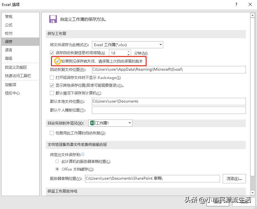 5、继续在【保存工作簿】栏中单击【如果我没保存就关闭,请保留上次自动保留的版本】复选框,显示打上√标识,点击*确定*按钮。