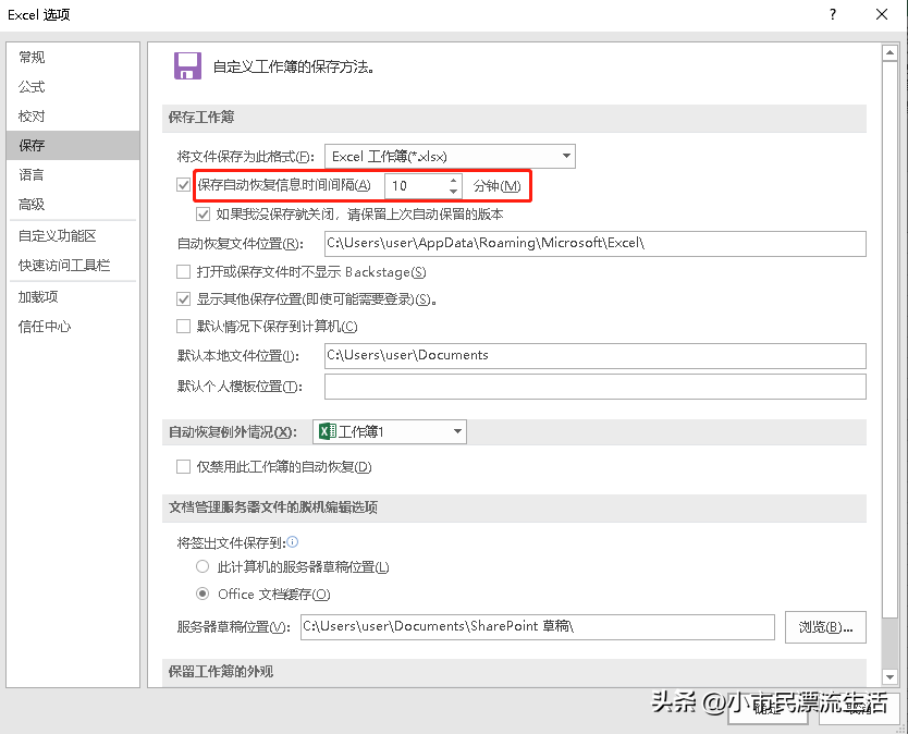 4、在在【保存工作簿】栏中单击*保存自动恢复信息时间间隔*前的复选框,并设置设置需要文件自动保存的间隔时间分钟(系统默认为10分钟)。