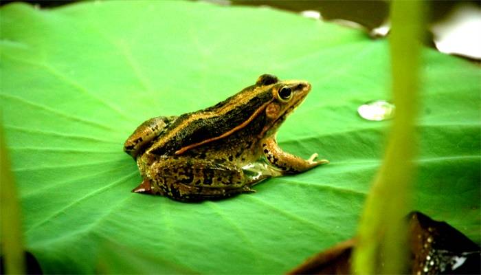 青蛙属于脊索动物门、两栖纲、无尾目、蛙科的两栖类动物,成体无尾,卵产于水中,体外受精,孵化成蝌蚪,用鳃呼吸,经过变异,成体主要用肺呼吸,兼用皮肤呼吸。上颌有齿,一般有犁骨齿。肩带固胸型,椎体参差型,荐椎横突柱状;指趾末端二骨节间没有间介软骨。鼓膜明显隐于皮下,皮肤光滑或有疣粒。舌一般长椭圆形,后端大多具缺刻。