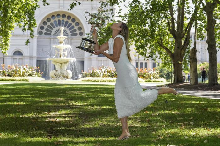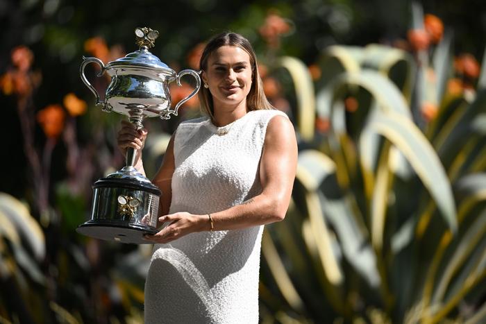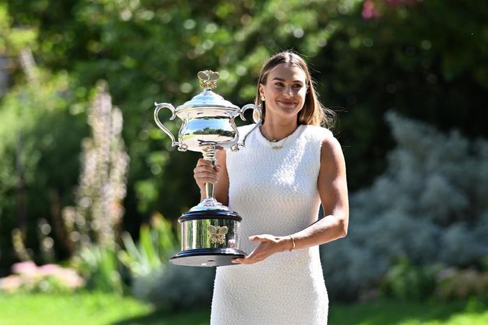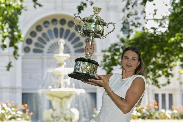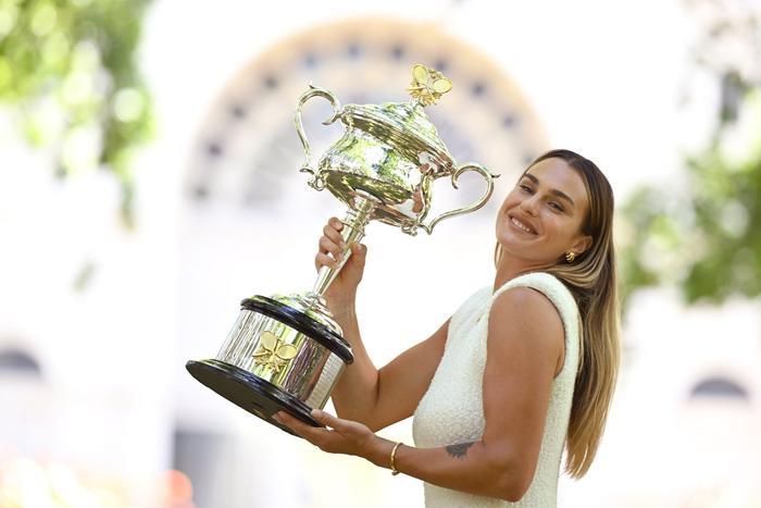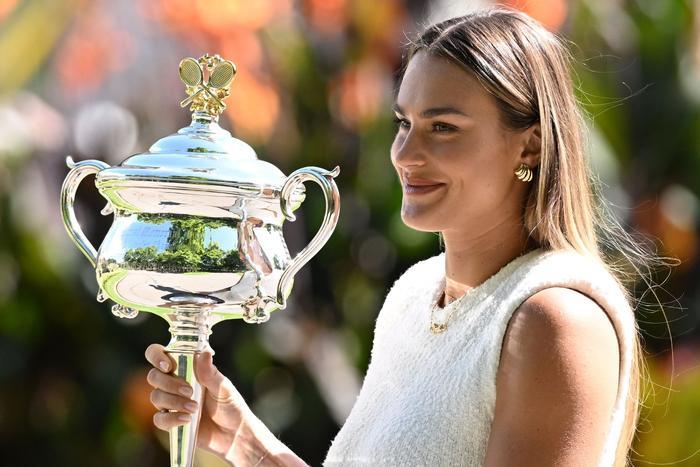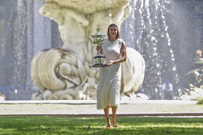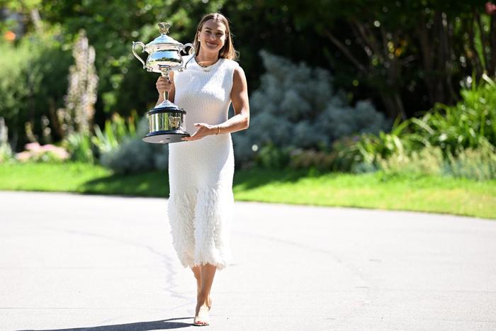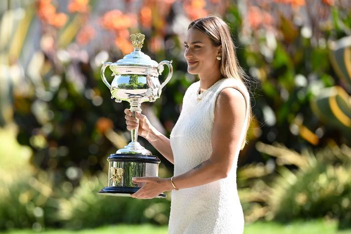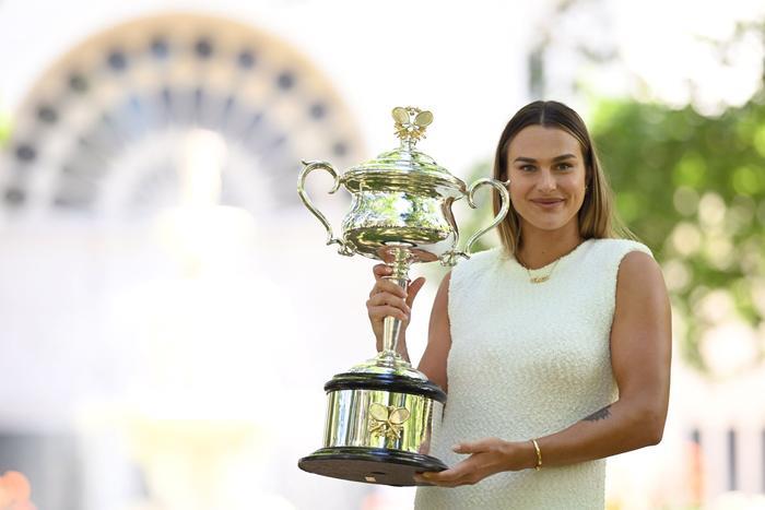 当日,2024年澳大利亚网球公开赛女子单打冠军、白俄罗斯选手萨巴伦卡在墨尔本卡尔顿园林皇家展览馆前展示冠军奖杯。