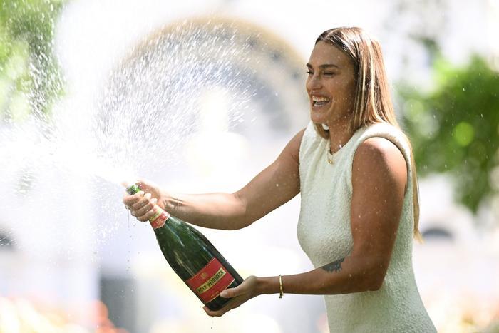 1月28日,萨巴伦卡喷洒香槟,庆祝夺冠。新华社/欧新