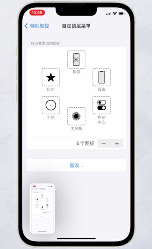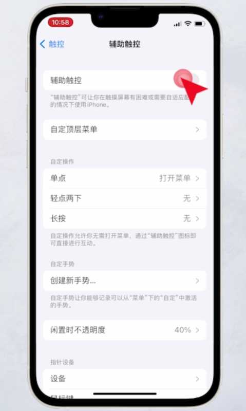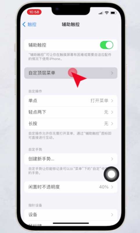 点击辅助触控,将辅助触控功能开启,然后点击自定顶层菜单