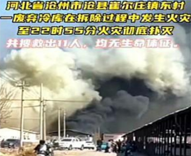 现场搜救出了11人,已经没有了生命体征,这11个人把生命葬送在了这座废弃的冷库里。2025年3月27日,河北沧州市发生了一起火灾,给当地居民和消防部门带来了巨大的震动,当地消防部门在得知发生火灾以后,也是第一时间出警赶赴现场进行救援,但由于火势实在太过于猛烈,一直持续到晚上10:55才将火全部扑灭。在救援的过程当中,也从冷库里救出了11个人,但令人痛惜的是这11人已经没有了生命体征,均已遇难,水火无情,只愿逝者安息。