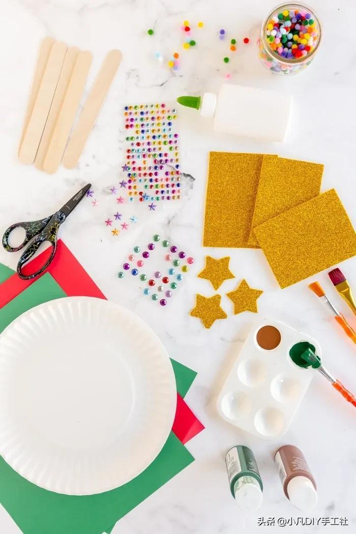材料和工具:纸盘、装饰、冰棒棍、卡纸、颜料、白乳胶、剪刀