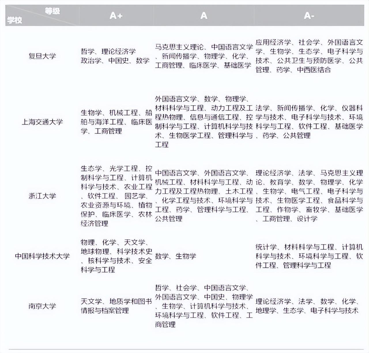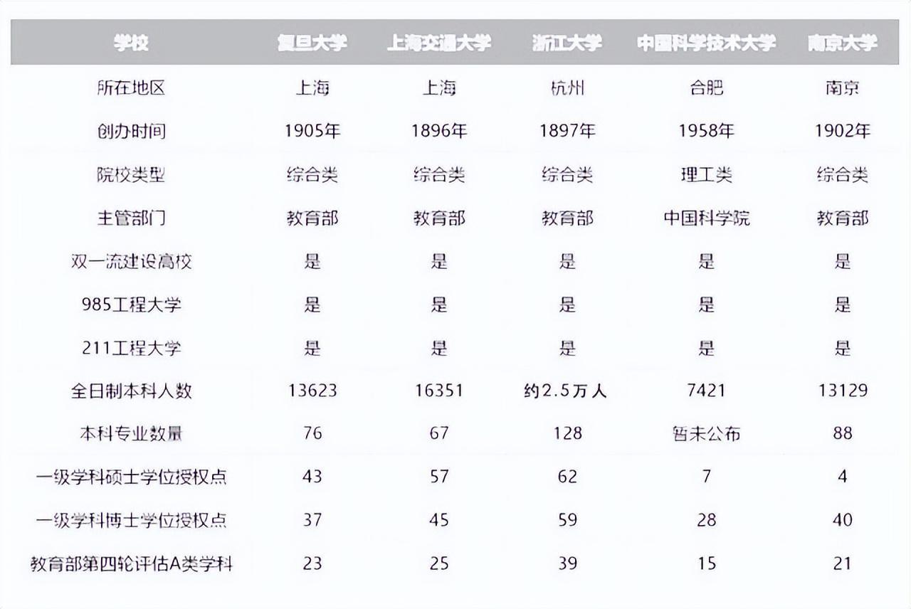 以五所大学获评A类的学科情况来看,五所大学擅长的领域还是不太一样的,整体来看工科是浙大、交大较强;理科是中科大、复旦、南大较强;人文社科是复旦、南大较强,浙大、交大次之;农科是浙大较强;医科是交大、浙大、复旦较强。