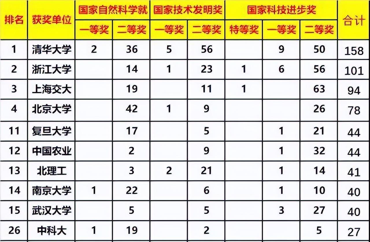 国家自然奖、国家技术发明奖、国家科技进步奖是我国科技领域影响最大的3个奖项,华五中的浙大、交大获奖较多,复南科3校较少,当然了文理社科为主的大学对应领域的专业人才较少,获评该奖项难度较大,获奖少也不代表就弱。