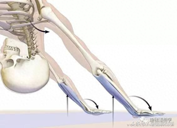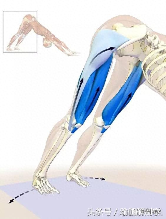 下犬式中腿部后侧的腘绳肌、小腿的腓肠肌都需延展向上。大腿内侧肌群收紧向上,腿部前侧股四头肌,髋外展肌群收紧向上。从上图的图四中可以发现,小腿腓肠肌以下的部分,力的走向向下,有所改变,这是因为下犬式中,我们的脚需要用力向下踩,臀部向上提,所以,在小腿部一部分力向上,一部分力向下。