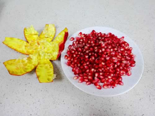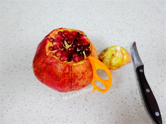 小贴士:用切橙器比用水果刀省事,不用担心切得太深把石榴籽切破流出石榴汁。