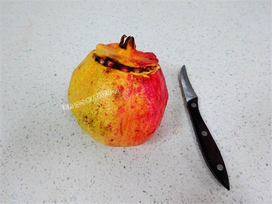 2用水果刀在石榴的顶部划一圈,划开石榴皮就行了不用太深,用刀尖撬一下划开的石榴皮,令石榴皮掀起来然后一拽顶盖就掉了,再用刀尖一挑把中间的白芯挑出去。