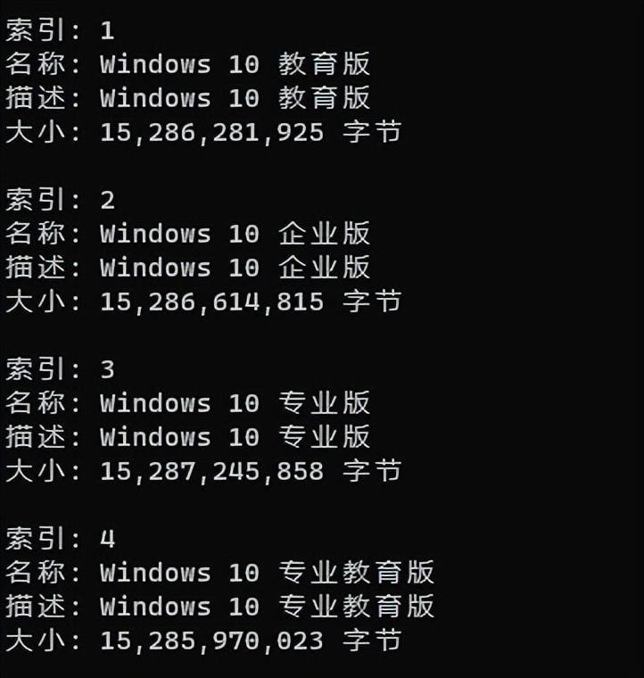 /index:1,这里的1是指install.wim中,我们使用的系统版本的索引号,你可以使用下面的命令查看与你当前系统对应的系统版本的索引号。