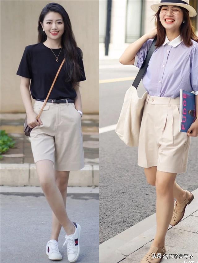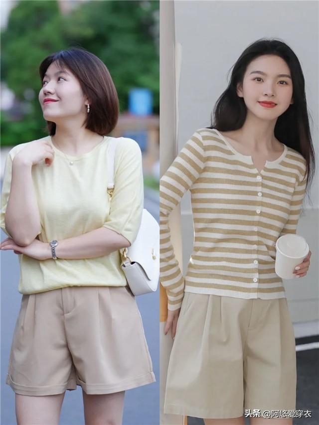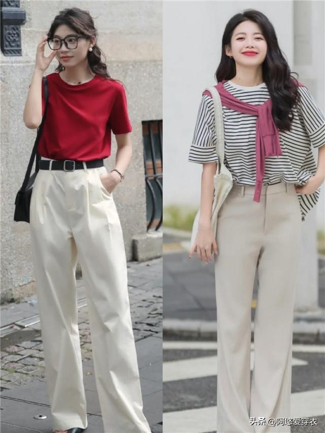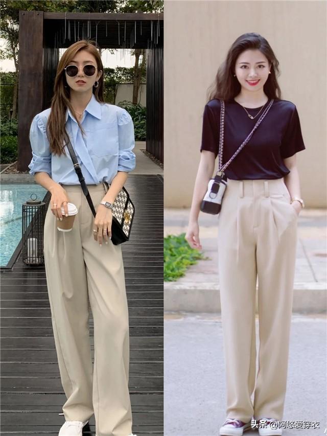 这种柔和的杏色裤装在夏季穿更容易展现出清爽感,相比那种深色的服装也更适合这个炎热的夏天,从视觉上来看也有降温效果。