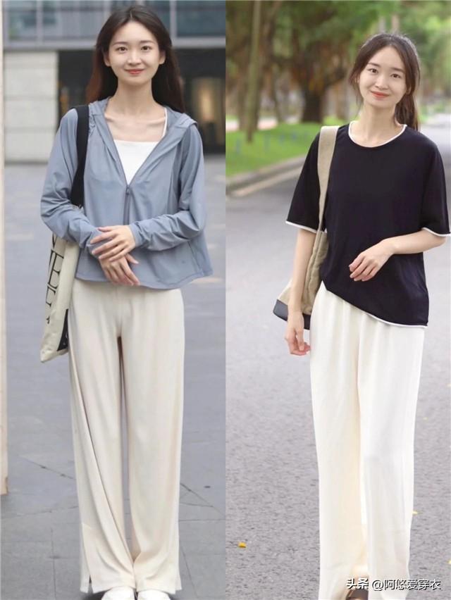 但防晒衫本身的设计感比较简单,很容易穿得老气,我们就需要去结合一些比较时尚的裤装。