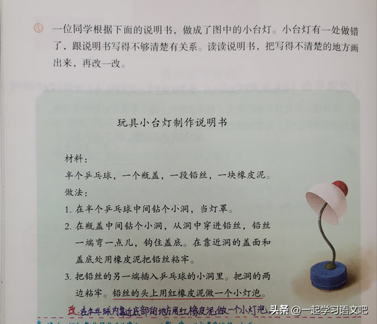 参考答案:写得不清楚的地方是:“铅丝的头上用红橡皮泥做一个小灯泡。”改为:在乒乓球内靠近底部的地方用红橡皮泥做一个小灯泡。