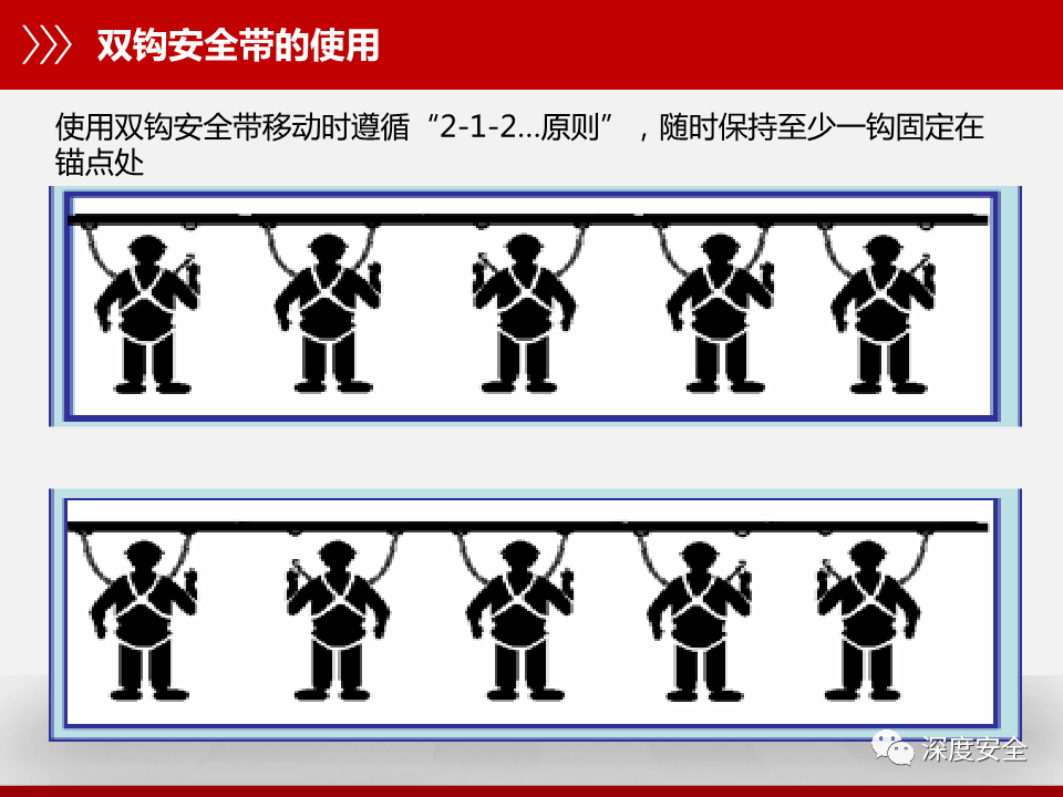 18、6接近屋面或地面开孔附近的梯子上7高处作业平台无可靠防坠落措施时3正确使用安全带的方法1禁止将安全带挂在不牢固或带尖锐角的构件上2利用安全带进行悬挂作业时,不能将挂勾直接勾在安全带绳。